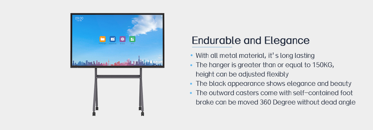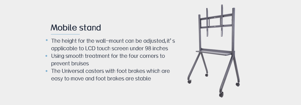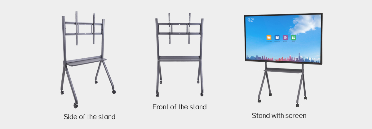 The Mobile Stand for Interactive Flat Panels is an adjustable and mobile stand designed to support interactive flat panels, such as touchscreens or interactive whiteboards, in various settings including classrooms, offices, and conference rooms. The stand is typically constructed with sturdy materials to ensure stability and safety while accommodating different sizes and weights of flat panels. It often features lockable casters for mobility while ensuring the unit remains stable during use. Additionally, the stand may include height adjustment mechanisms, tilt functionality, and cable management systems to provide an organized and accessible setup for both users and operators.