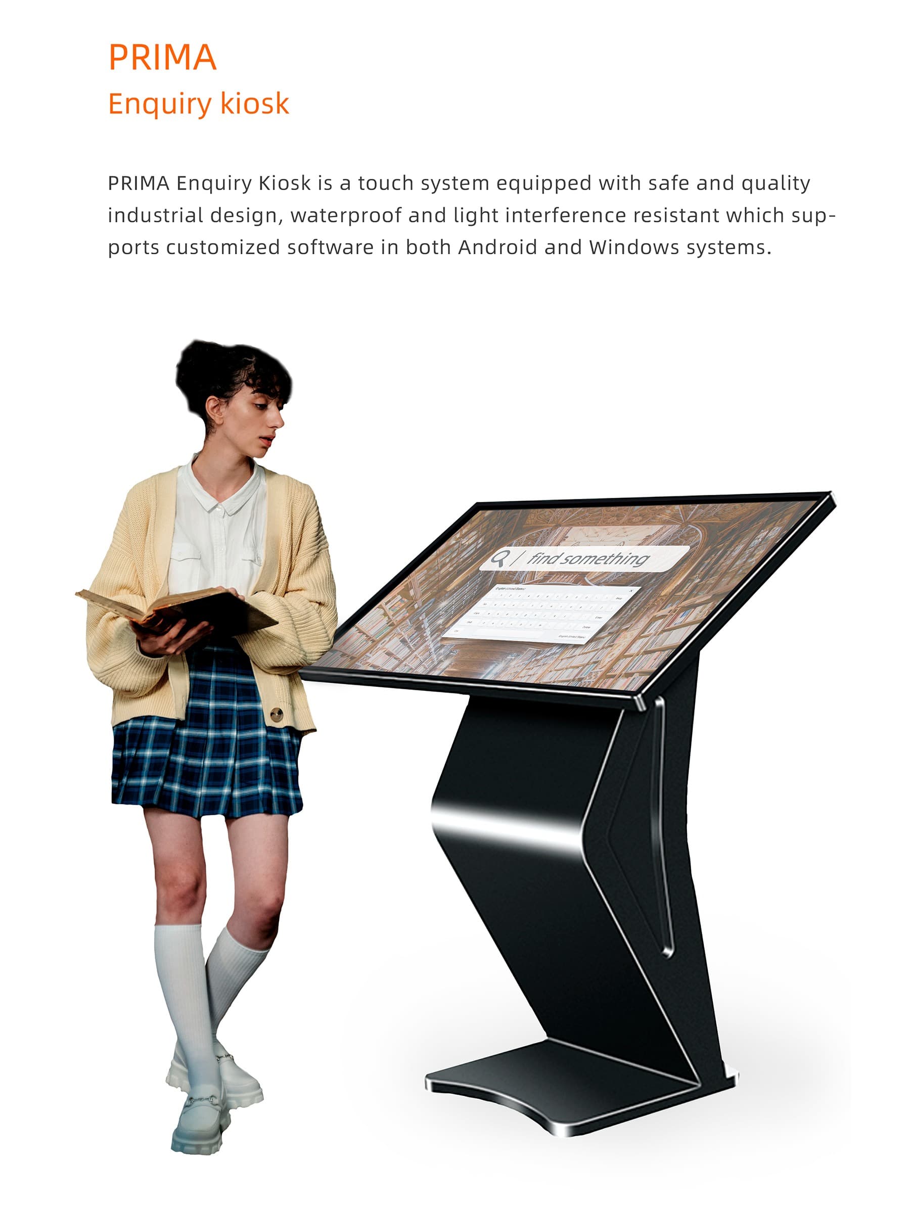 PRIMA Enquiry Kiosk is a touch system equipped with safe and quality industrial design, waterproof and light interference resistant which supports customized software in both Android and Windows systems.